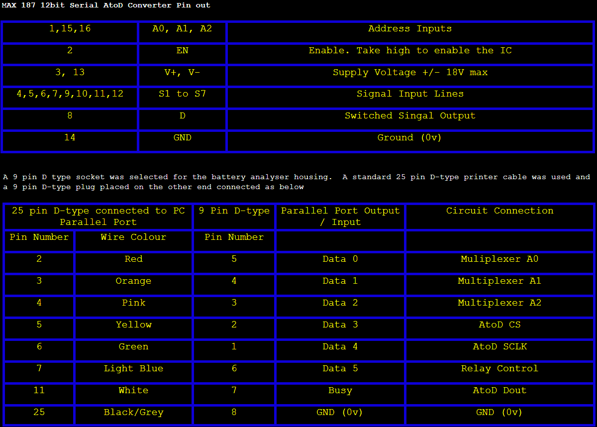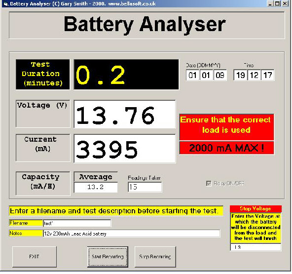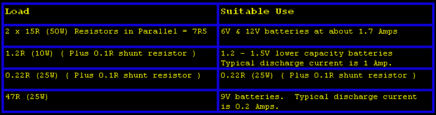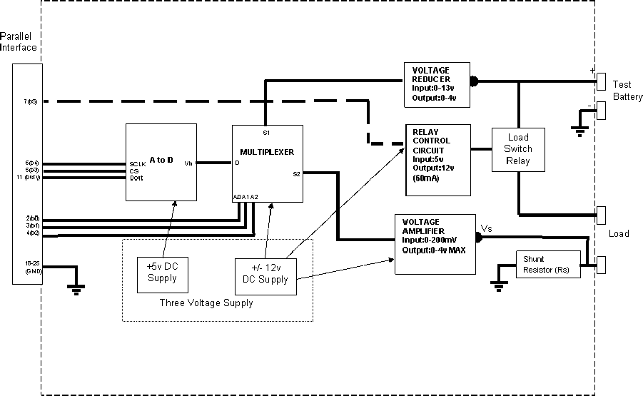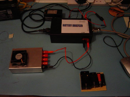 A battery under test is discharged through a load, which will vary depending on the type of battery being analysed. The voltage of the battery and current delivered through the load are monitored by a computer until the battery voltage falls to the minimum discharge level. The software will then display the capacity of the battery. The unit is controlled via the Parallel port of a PC using Visual Basic 6.