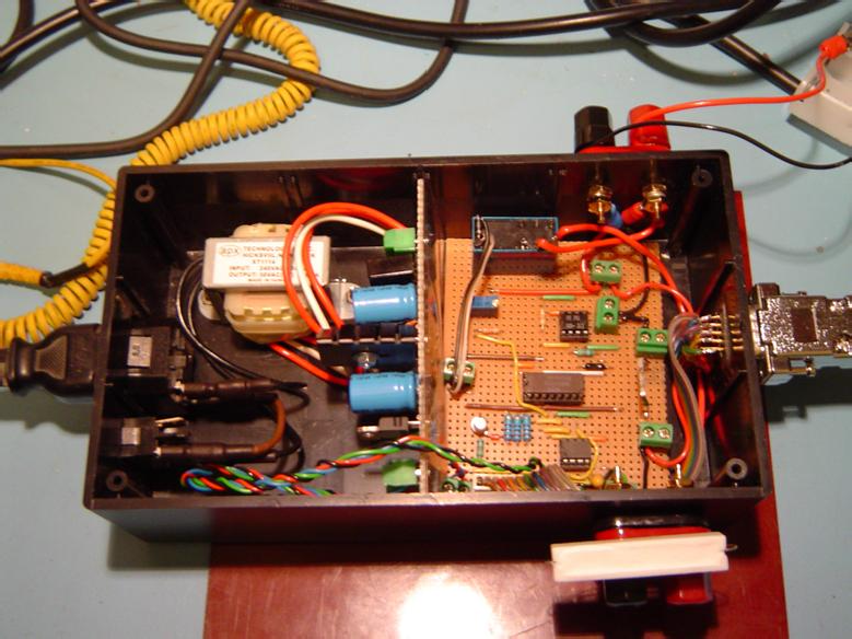 Constructed unit showing PSU board and interface board mounted in box
