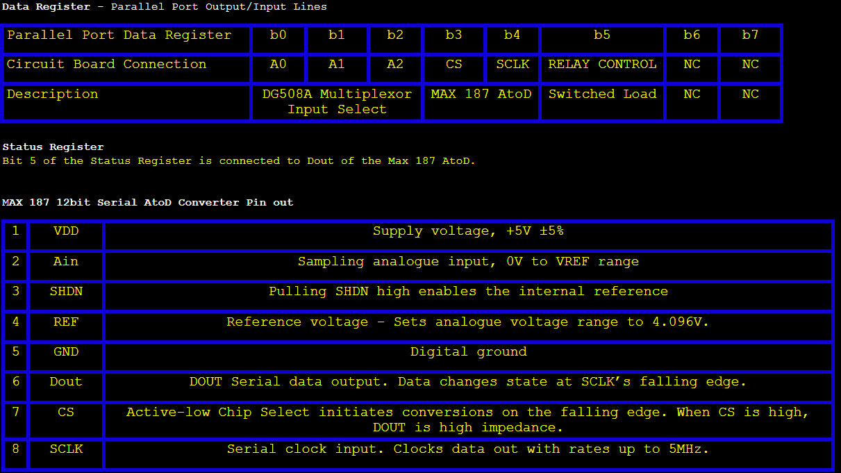 The Data Register and the Status Register of the parallel port are used to interface with the analyser. This can be implemented fairly easily using Visual Basic 6 or MS QuickBasic.