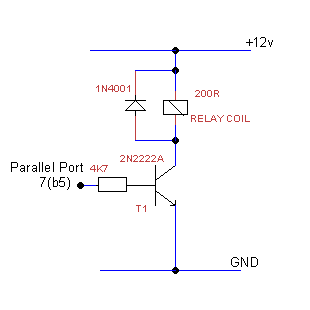 The relay is triggered by the output of b5 on the parallel port. The relay coil requires 12v to energise. The resistance of the coil is 200ohms, therefore a current of 12v / 200ohms = 60mA will be drawn. The parallel port output of 5v at a maximum of 12mA isn’t sufficient to energise the relay coil. The circuit below will allow the +5v signal from the parallel port to switch +12v.