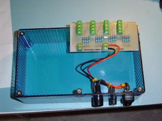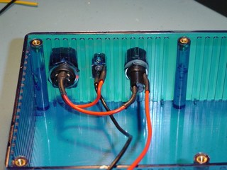 This picture shows the wiring of the 12V DC input, Fuse and Switch. Power comes into the box via the DC input socket. The +12V line (Red Wire) then goes through the switch to the fuse. The other side of the fuse will be connected to the +12V of the circuit board, which I will describe later. The black wire is the 0V input.