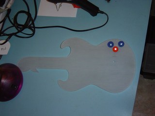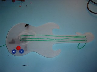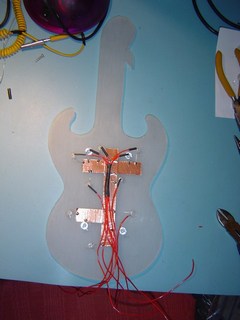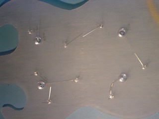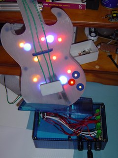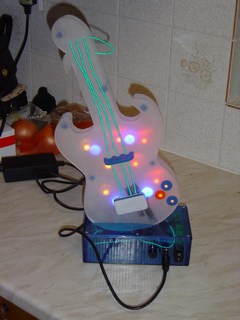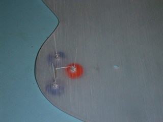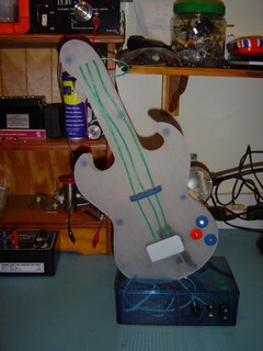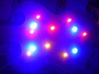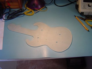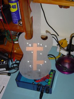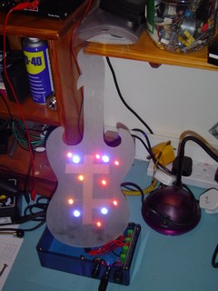 Here you can see one piece of the guitar. this is the back panel. It is made out of brushed Perspex. You can see that I have drilled some holes. I will be mounting some high intensity Light Emitting Diodes (LED's) in these.