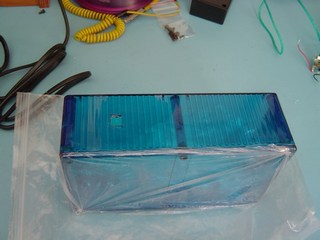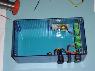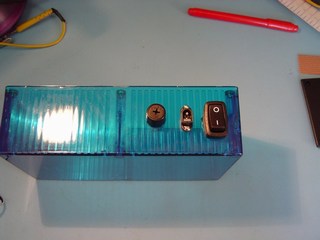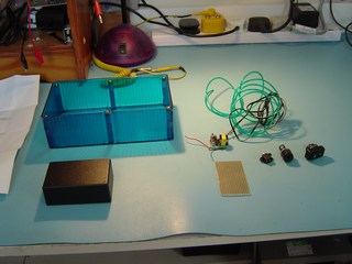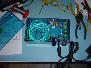 First of all I assembled the components for the lamp base. The blue box is the base. In the picture you can also see the12V DC input socket, fuse and switch. The lamp power is obtained from a 12V power supply, similar to the ones used for Laptops. The Green Neon wire can be seen with the Neon Power Supply.