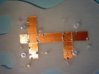 The LED's have now been wired up. Remember from earlier, the Cathode (negative) wire of each LED has been soldered to the copper tape. A single black wire is soldered to the copper tape, this wire will be connected to the 0v terminal on the LED circuit board, in the box. Using this method all the Cathode's are connected together. A red wire has been soldered to each Anode (positive) of the LED's.