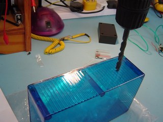 I started by drilling the holes in the side of the box for the 12V DC socket, fuse and switch.